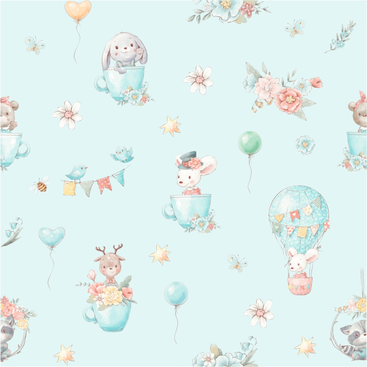 "Friends & Peace" világoskék babaszoba tapéta gyerek mintás, unisex gyerektapéta