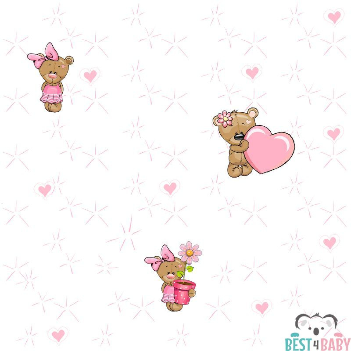 Fehér, maci kislány babaszoba tapéta, Maci szívvel, virággal, fehér gyerektapéta